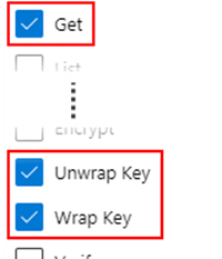Pada menu drop-down Izin Kunci, pilih izin Get, Unwrap Key, dan Wrap Key: