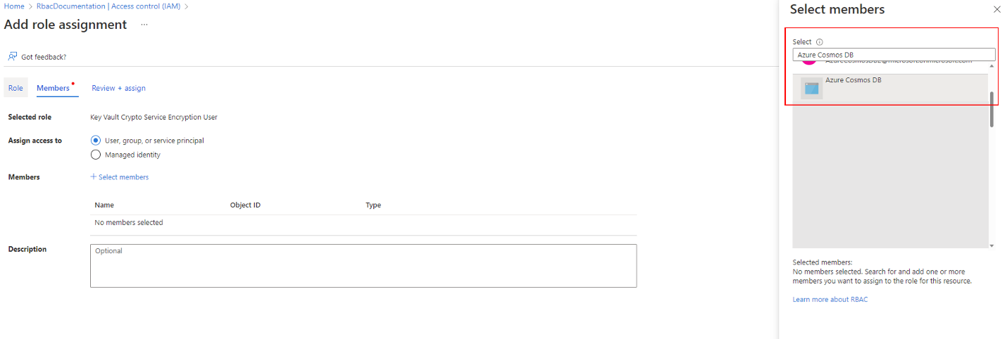Kemudian, izin yang diperlukan harus ditetapkan ke perwakilan Cosmos DB. Sama seperti langkah-langkah penetapan peran terakhir, buka halaman penugasan, tetapi kali ini cari peran Pengguna Enkripsi Layanan Kripto Key Vault dan pada tab anggota cari prinsipal Cosmos DB. Untuk menemukan prinsipal, cari prinsipal Azure Cosmos DB dan pilih.
