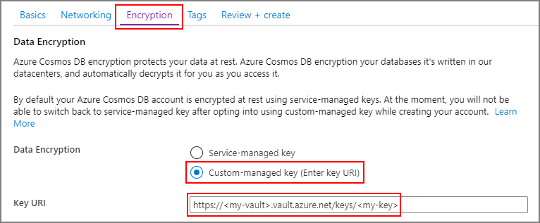 Saat Anda membuat akun Azure Cosmos DB baru dari portal Microsoft Azure, pilih Kunci yang dikelola pelanggan di langkah Enkripsi . Di bidang URI Kunci , tempelkan pengidentifikasi URI/kunci kunci Azure Key Vault yang Anda salin dari langkah sebelumnya: