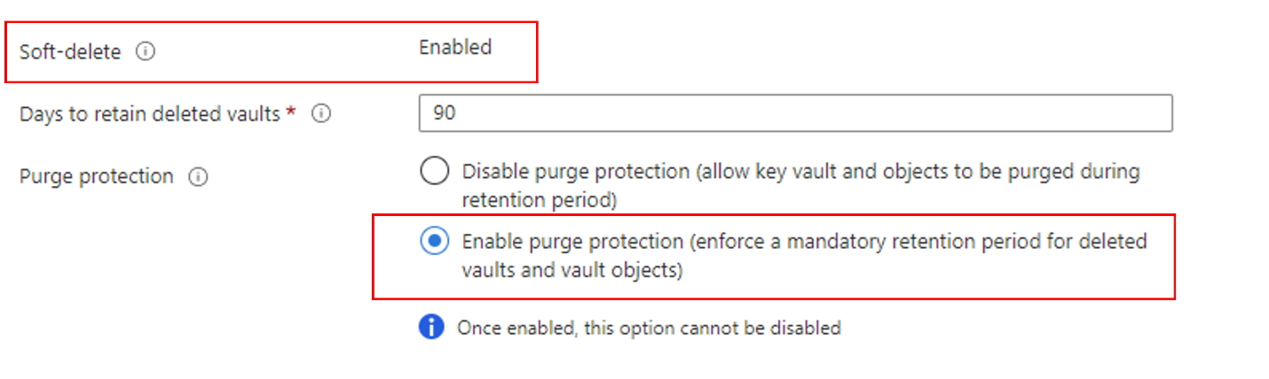 - Jika Anda menggunakan instans Azure Key Vault yang sudah ada, Anda dapat memverifikasi bahwa properti ini diaktifkan dengan melihat bagian Properti di portal Microsoft Azure. Jika salah satu properti ini tidak diaktifkan, lihat bagian Mengaktifkan penghapusan lunak dan Mengaktifkan Perlindungan Penghapusan di salah satu artikel berikut ini: