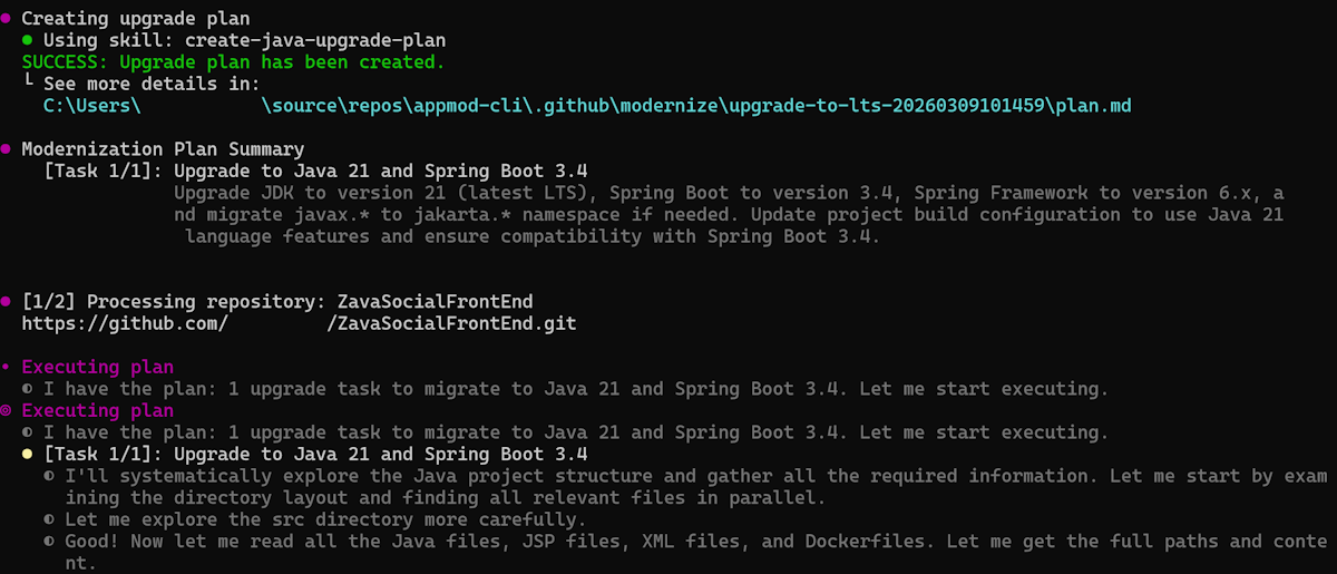 cd <repository-name> gh pr create --title "Upgrade to Java 21" --body "Automated upgrade by modernization agent"