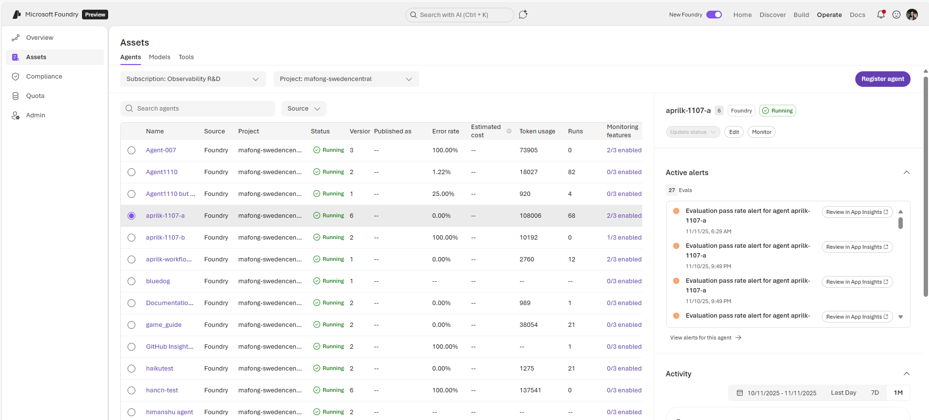 Foundry Control Plane menemukan semua agen yang dapat Anda akses. Ini menggunakan sumber daya Application Insights yang menghosting agen Anda untuk membantu Anda memantau dan mendiagnosis agen tersebut.
