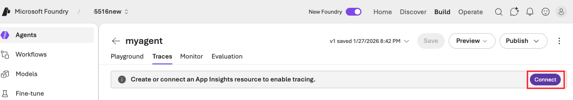Konfirmasikan proyek Anda terhubung ke Application Insights. Jika diperlukan, ikuti langkah-langkah dalam Menyambungkan Application Insights ke proyek Foundry Anda.