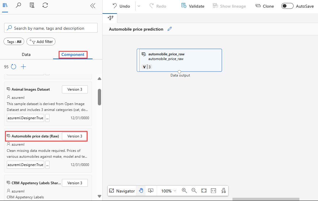 Di himpunan data dan palet komponen di sebelah kiri kanvas, pilih Komponen dan cari komponen Regresi Linier .