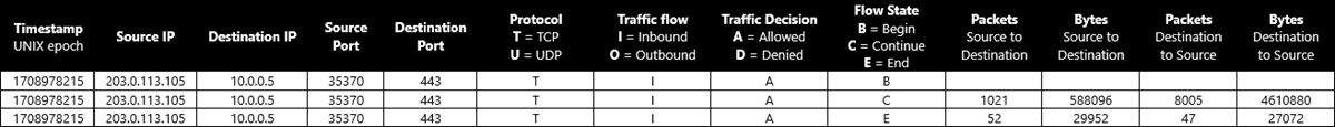 - Setiap rekaman log berisi antarmuka jaringan (NIC) yang diterapkan alur, informasi 5 tuple, keputusan lalu lintas, dan (hanya untuk versi 2) informasi throughput.