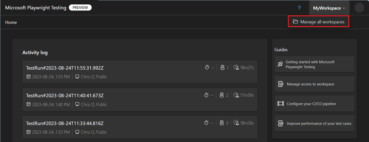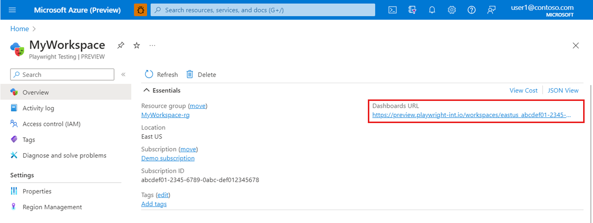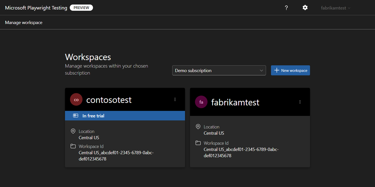 Dalam artikel ini, Anda membuat, menampilkan, dan menghapus ruang kerja Pratinjau Pengujian Microsoft Playwright. Anda dapat mengakses dan mengelola ruang kerja di portal Azure atau di portal Playwright.
