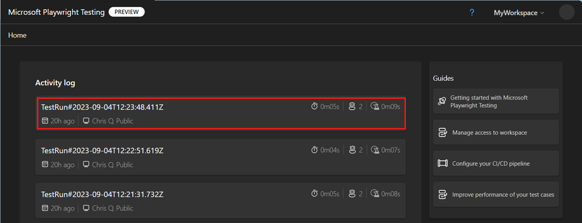 Anda dapat melihat daftar uji coba untuk ruang kerja di portal Playwright. Pengujian Microsoft Playwright hanya menyimpan metadata uji coba, dan tidak menyimpan kode pengujian, hasil pengujian, file pelacakan, atau artefak lainnya.