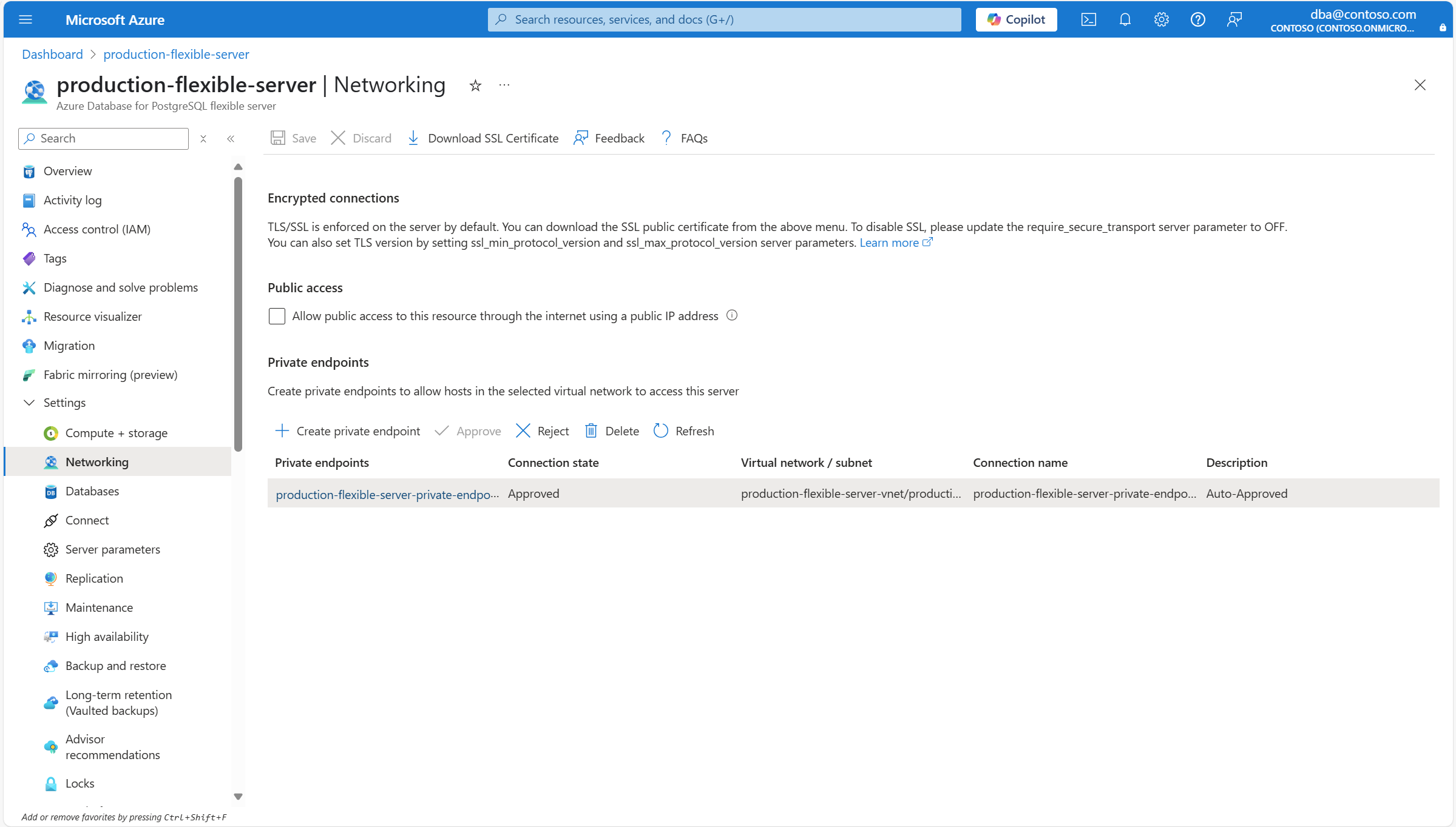 Prosedur sebelumnya tidak menghapus titik akhir privat, tetapi hanya koneksi yang dibuat antara titik akhir privat tersebut dan instans Server fleksibel Azure Database for PostgreSQL Anda. Untuk mempelajari cara menghapus titik akhir pribadi, lihat Mengelola titik akhir pribadi Azure.
