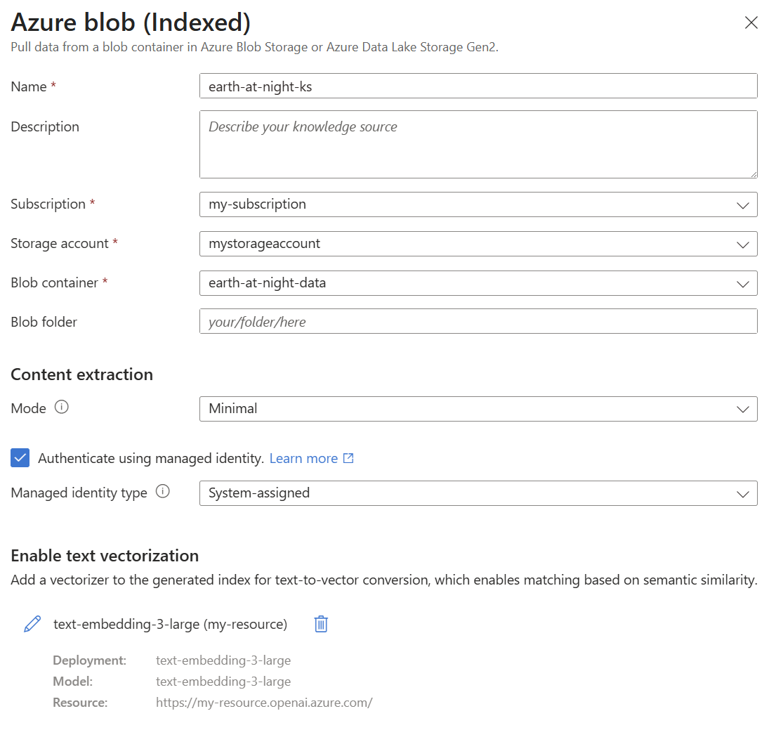 Sumber pengetahuan yang mereferensikan kontainer di Azure Blob Storage. Saat Anda membuat sumber pengetahuan blob, Azure AI Search secara otomatis menghasilkan indeks dan objek alur lainnya untuk menyerap dan memperkaya konten Anda untuk pengambilan agenik.