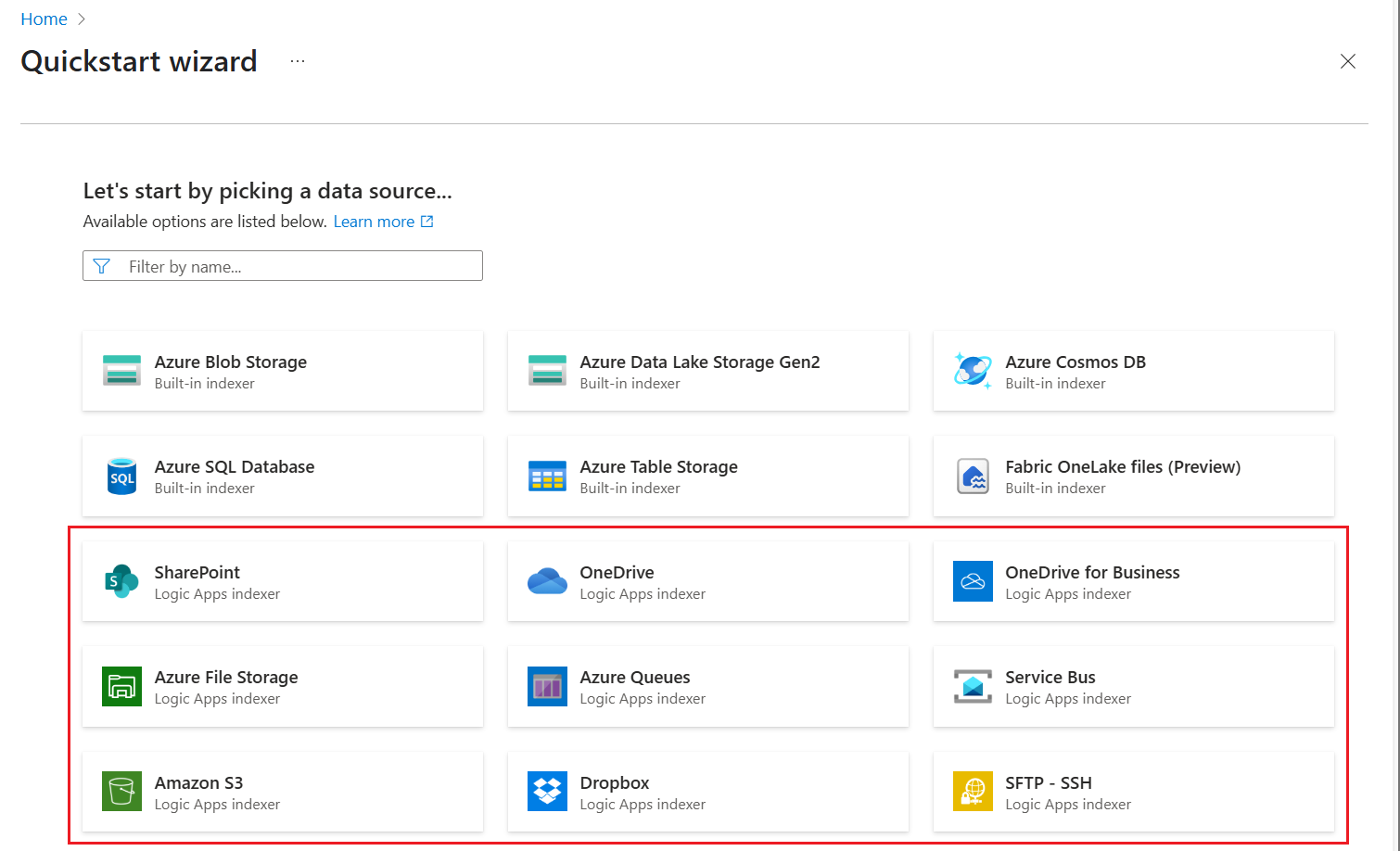 | Sumber daya dan alur kerja aplikasi logika | Azure Logic Apps | Anda dapat melihat alur kerja yang sedang berjalan, atau Anda dapat membuka perancang di Azure Logic Apps untuk mengedit alur kerja, seperti yang Anda lakukan secara teratur jika Anda memulai dari Azure Logic Apps sebagai gantinya. Anda dapat mengedit dan memperluas alur kerja, tetapi berhati-hatilah agar tidak merusak alur pengindeksan. Alur kerja yang dibuat oleh wizard menggunakan opsi hosting Konsumsi . |