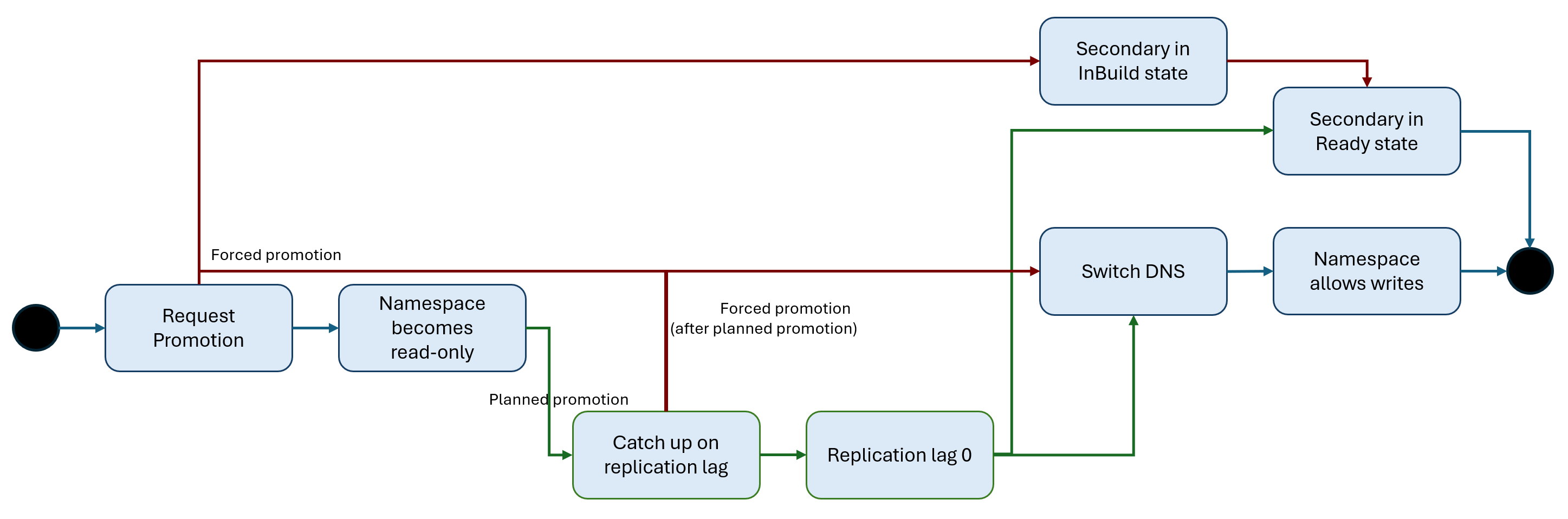 - Promosi yang direncanakan: Layanan menunggu untuk mengejar ketertinggalan replikasi sebelum memulai promosi. Namespace ditempatkan dalam mode baca-saja selama waktu ini, menolak pesan baru dan operasi konsumen hingga promosi selesai.