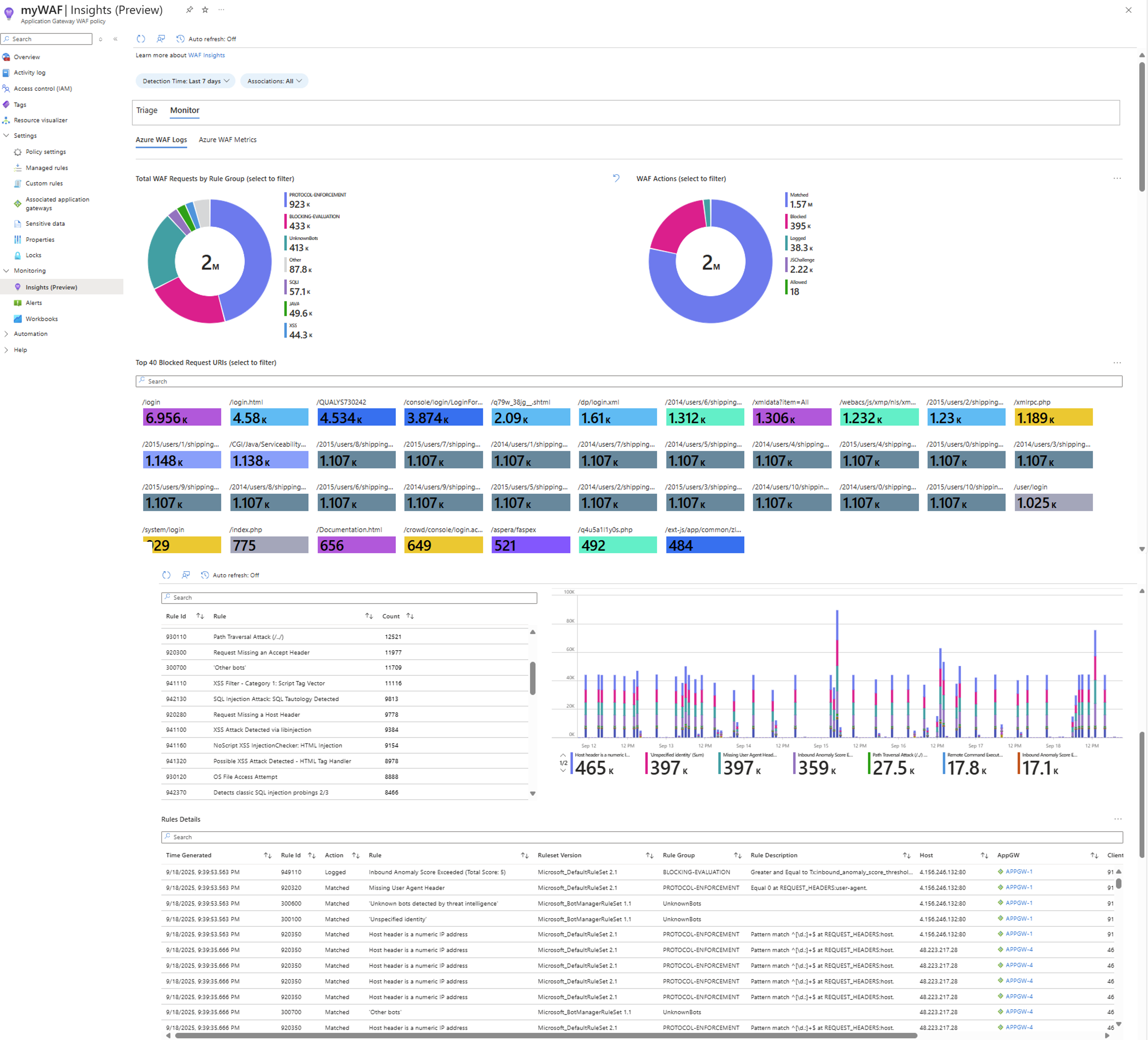 Tampilan log WAF memberikan perspektif tingkat permintaan terperinci yang bersumber dari tabel AzureDiagnostics di LAW. Ini termasuk visualisasi seperti total permintaan WAF menurut grup aturan, tindakan WAF berdasarkan jenis (misalnya, Diblokir), URI yang diblokir teratas, aturan yang dipicu teratas dari waktu ke waktu, dan detail peristiwa aturan yang dipicu dengan tanda waktu, host, instans AppGW, dan IP klien. Analis juga dapat menghubungkan data dengan melacak ID, meninjau IP paling menyinggung, dan memeriksa permintaan terkait untuk mendeteksi serangan yang ditargetkan, memvalidasi efektivitas aturan, dan mendukung audit atau tinjauan kepatuhan.