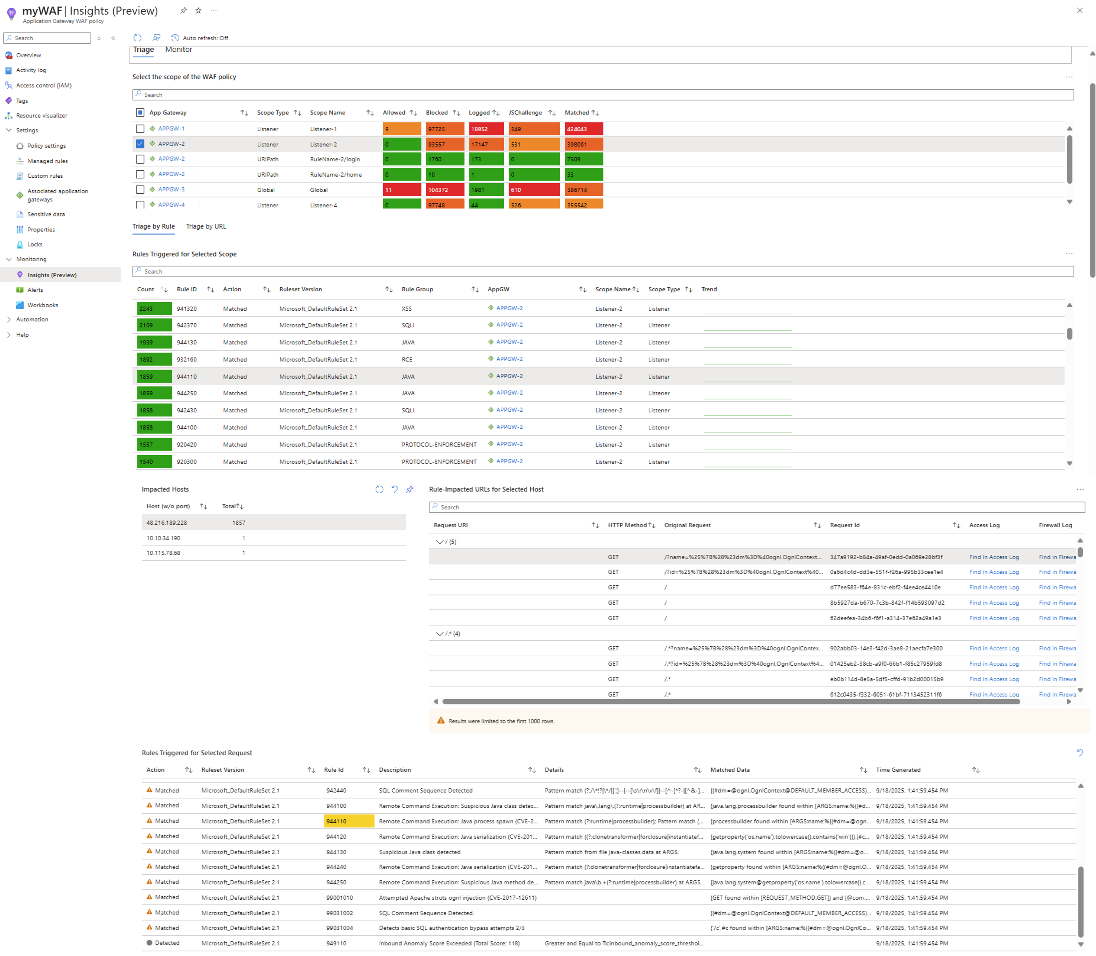 Dalam Triage by Rule, penyelidikan dilakukan dimulai dari aturan yang dipicu. Alur dimulai dengan memilih cakupan kebijakan WAF (Listener, Jalur URI, atau Global). Selanjutnya, Anda dapat melihat gambaran umum aturan yang dipicu, termasuk ID aturan, tindakan, versi ruleset, cakupan, dan jumlah permintaan yang terkena dampak. Dari sana, investigasi mendalami host, URL, dan transaksi individual yang terpengaruh. Pendekatan ini membantu mengidentifikasi aturan mana yang bertanggung jawab atas sebagian besar lalu lintas yang diblokir, mendeteksi positif palsu, dan memahami host dan URL mana yang paling terpengaruh.