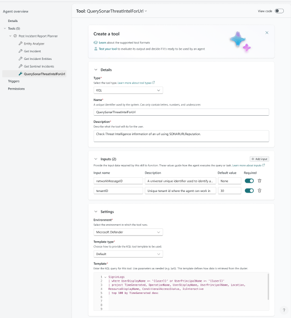 Tools (skills) are the capabilities that the agent can use to perform specialized tasks or interact with external systems. Microsoft Security Copilot enables developers to configure agents with a set of predefined tools. Developers can author their own tools using the agent builder or the tools provided by Security Copilot in the Tool catalog. See, Create Security Copilot Agent.