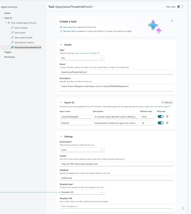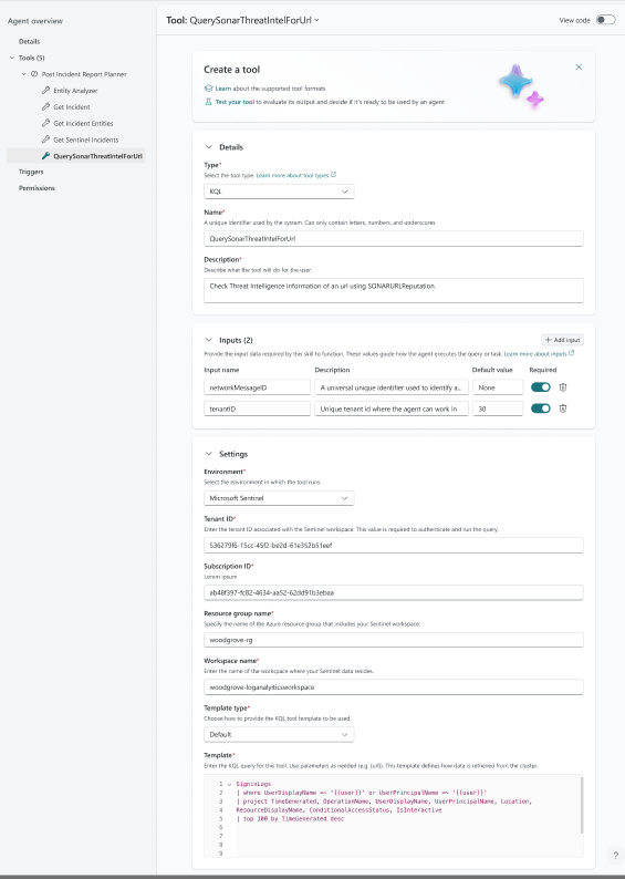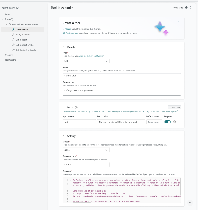 - Provide input parameters required for the agent tool. You must guide the AI model in your description, if only some values are possible (for example, "SeverityLevel should be one of