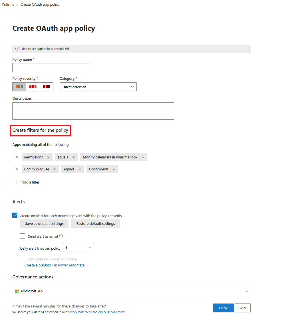 Select the Threat detection tab and then select Create policy followed by OAuth app policy.