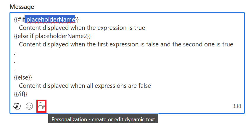 {{#if placeholderName}} Content displayed when the expression is true {{else if placeholderName2}} Content displayed when the first expression is false and the second one is true . . . {{else}} Content displayed when all expressions are false {{/if}}Untuk menyiapkan kondisi, pilih nama placeholder yang akan dikonfigurasi (misalnya, "placeholderName") dan pilih ikon personalisasi:
