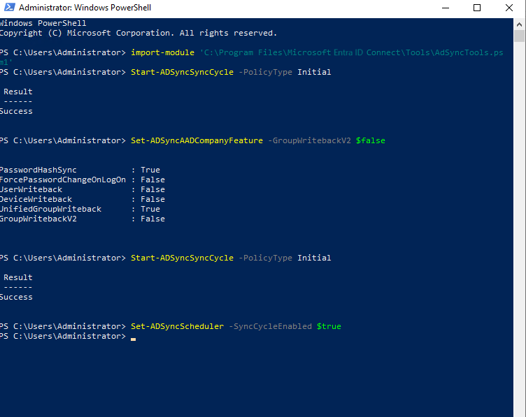 Set-ADSyncAADCompanyFeature -GroupWritebackV2 $falseJalankan siklus sinkronisasi penuh lagi: