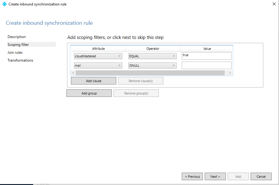 Atribut Pengoperasi Nilai cloudMasteredEQUALtruemailISNULLPada halaman Aturan gabungan, pilih Berikutnya.