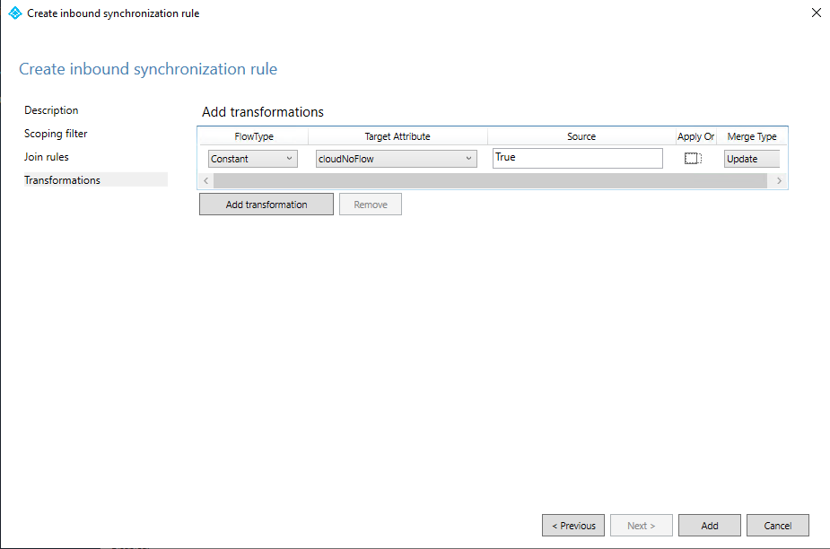 Pada halaman Tambahkan transformasi , untuk FlowType, pilih Konstanta. Untuk Atribut Target, pilih cloudNoFlow. Untuk Sumber, pilih True.