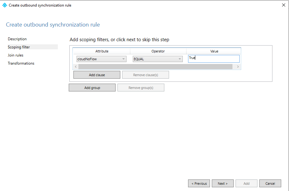 Anda juga memerlukan aturan sinkronisasi keluar dengan tautan jenis JoinNoFlow dan filter cakupan di mana atribut cloudNoFlow diatur ke True. Aturan ini memberi tahu Microsoft Entra Connect untuk tidak menyinkronkan atribut untuk grup ini. Untuk membuat aturan sinkronisasi ini, Anda dapat memilih untuk menggunakan antarmuka pengguna atau membuatnya melalui PowerShell dengan skrip yang disediakan.