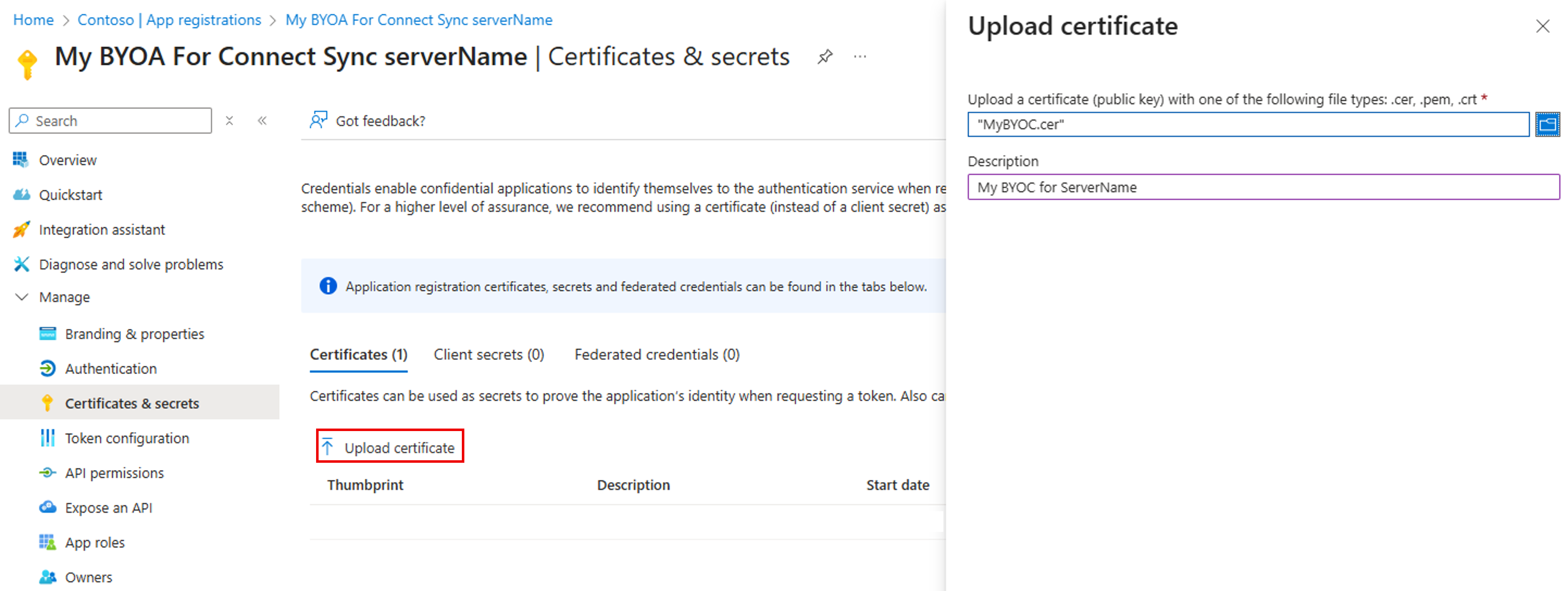 Di Pusat Admin Microsoft Entra, navigasikan ke Pendaftaran AplikasiEntra ID, dan pilih aplikasi yang dibuat selama penginstalan, konfigurasi, atau peningkatan Connect Sync. Untuk mengonfirmasi aplikasi mana yang digunakan oleh Connect Sync, Anda dapat menjalankan Get-ADSyncEntraConnectorCredential perintah untuk mengambil ID aplikasi (klien). Format nama pengguna adalah {AppID}@tenantName.onmicrosoft.com. Di bawah Sertifikat & rahasia pilih Unggah sertifikat dan unggah file .cer yang diekspor dan pilih Tambahkan: