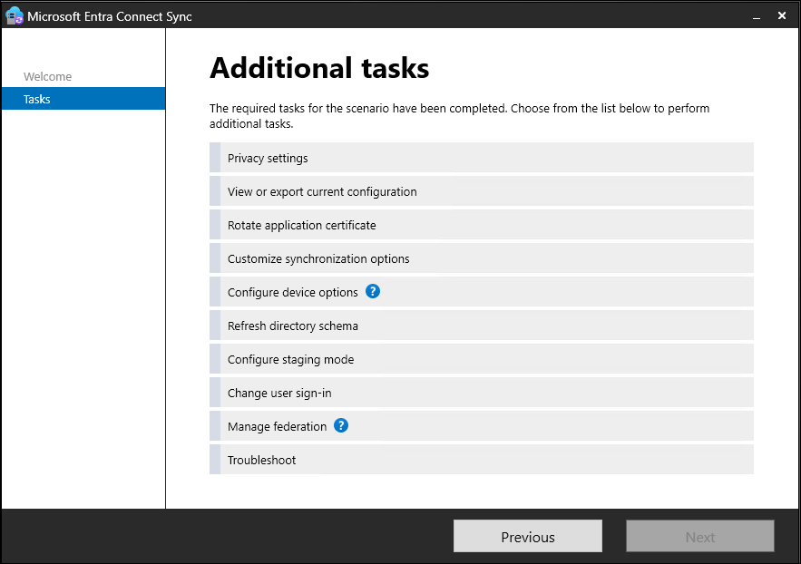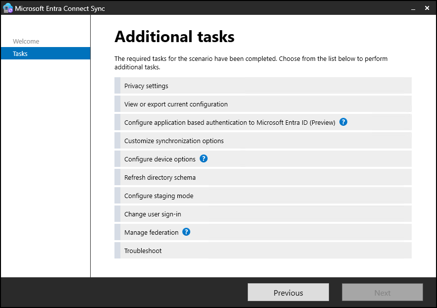 Microsoft Entra Connect menyediakan tiga opsi untuk manajemen aplikasi dan sertifikat:
