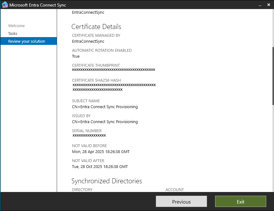 Microsoft Entra Connect mengelola aplikasi dan sertifikat, yang mencakup pembuatan, rotasi, dan penghapusan sertifikat. Sertifikat disimpan di penyimpanan CURRENT_USER . Untuk perlindungan optimal kunci privat sertifikat, kami sarankan mesin harus menggunakan solusi Modul Platform Tepercaya (TPM) untuk menetapkan batas keamanan berbasis perangkat keras.