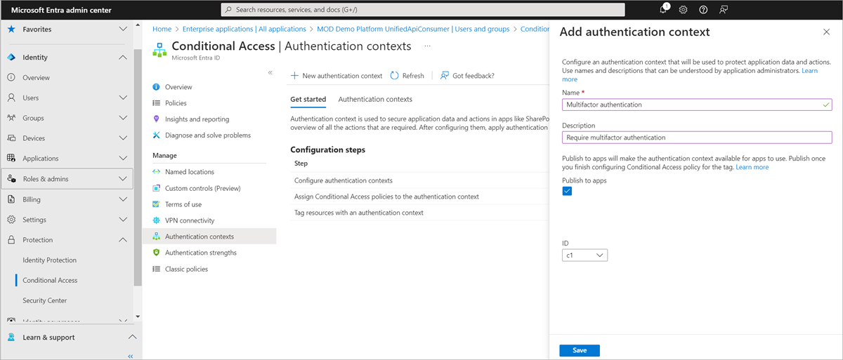 Tindakan yang dilindungi ditambahkan dengan menetapkan nilai konteks autentikasi ke izin. Nilai konteks autentikasi yang tersedia di penyewa dapat ditemukan dengan memanggil API authenticationContextClassReference .