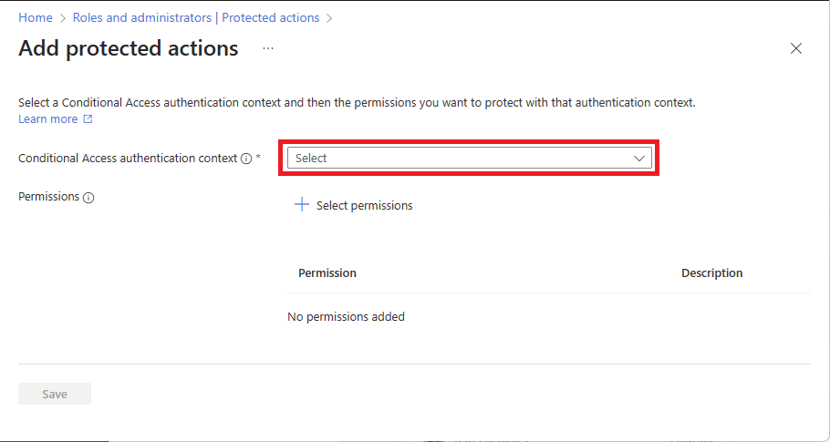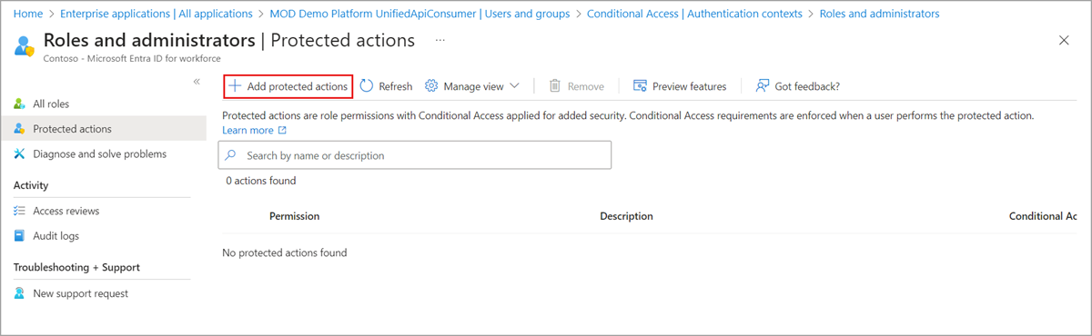 Jika Tambahkan tindakan yang dilindungi dinonaktifkan, pastikan Anda ditugaskan peran Administrator Akses Bersyarat atau Administrator Keamanan. Untuk informasi selengkapnya, lihat Mengatasi masalah tindakan yang dilindungi.