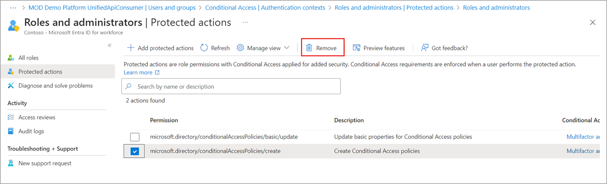 Setelah Anda menghapus tindakan yang diproteksi, izin tidak akan memiliki persyaratan Akses Bersyarat. Kebijakan Akses Bersyarat baru dapat ditetapkan pada izin.