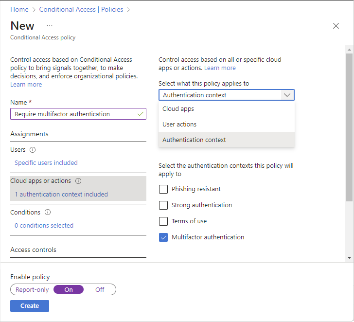 Tindakan yang dilindungi menggunakan konteks autentikasi Akses Bersyarat, sehingga Anda harus mengonfigurasi konteks autentikasi dan menambahkannya ke kebijakan Akses Bersyarat. Jika Anda sudah memiliki kebijakan dengan konteks autentikasi, Anda dapat melompat ke bagian berikutnya.