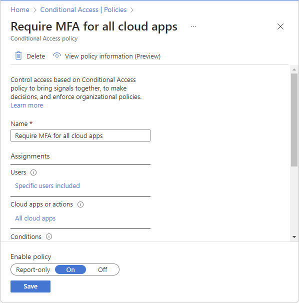 Buat kebijakan Akses Bersyarat jika belum ada, atau jika sudah ada, atur status ke Aktif.