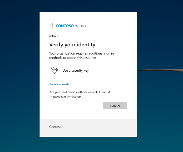 Saat pengguna melakukan tindakan yang dilindungi, mereka harus memenuhi persyaratan kebijakan Akses Bersyarat. Bagian ini menunjukkan pengalaman bagi pengguna yang diminta untuk memenuhi kebijakan. Dalam contoh ini, pengguna diharuskan untuk mengautentikasi dengan kunci keamanan FIDO sebelum mereka dapat memperbarui kebijakan Akses Bersyarat.