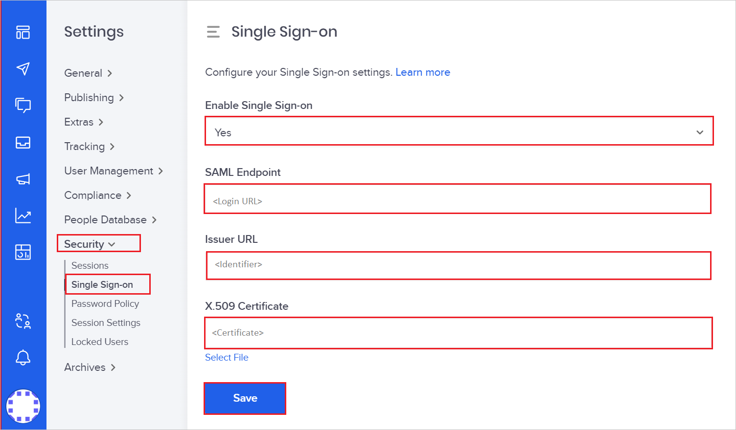 konfigurasi Oktopost SAMLsebuah. Pilih Aktifkan Single Sign-on untuk Ya.
