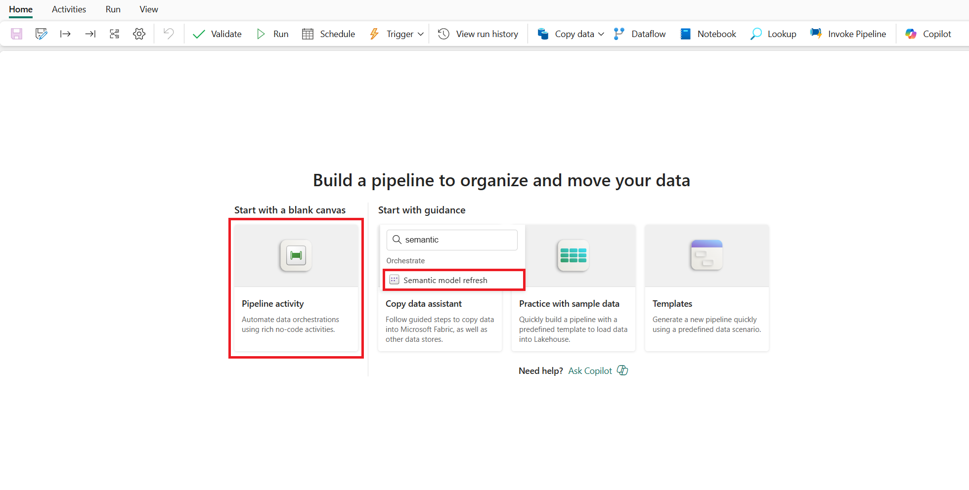 Temukan "Penyegaran model semantik" dari layar utama kartu Aktivitas Alur dan pilihlah, atau pilihlah dari bilah Aktivitas untuk menambahkannya ke dalam kanvas alur.
