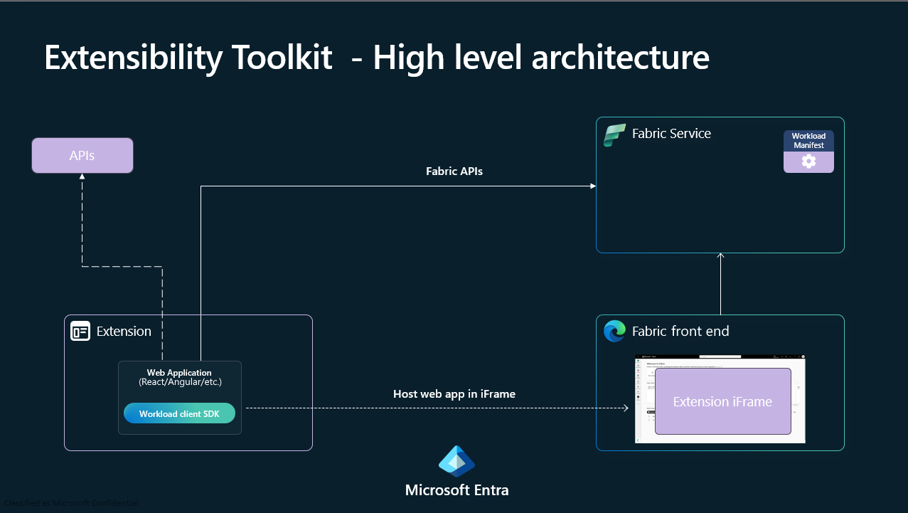 Beban kerja Anda adalah aplikasi web (misalnya, React atau Angular) yang Anda host di cloud Anda. Fabric memuatnya dalam iFrame dan menyediakan API host untuk diintegrasikan dengan platform. Aplikasi ini mengimplementasikan rute dan permukaan UI yang dideklarasikan dalam manifesnya, menggunakan token ID Microsoft Entra (disediakan oleh host) untuk memanggil API publik Fabric dan, jika diperlukan, layanan back-end Anda sendiri, dan mengikuti panduan Fabric UX sehingga terlihat dan berperilaku seperti pengalaman asli.