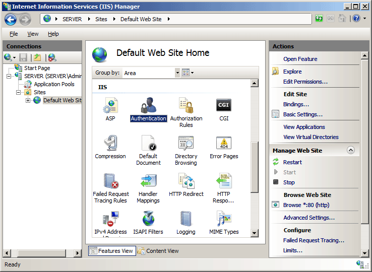 Di panel Koneksi , perluas nama server, perluas Situs, lalu klik situs, aplikasi, atau layanan Web yang ingin Anda aktifkan autentikasi dasarnya.