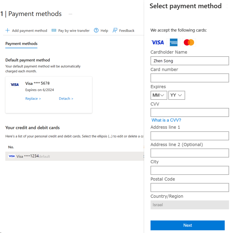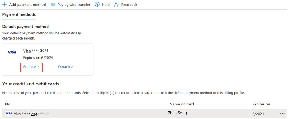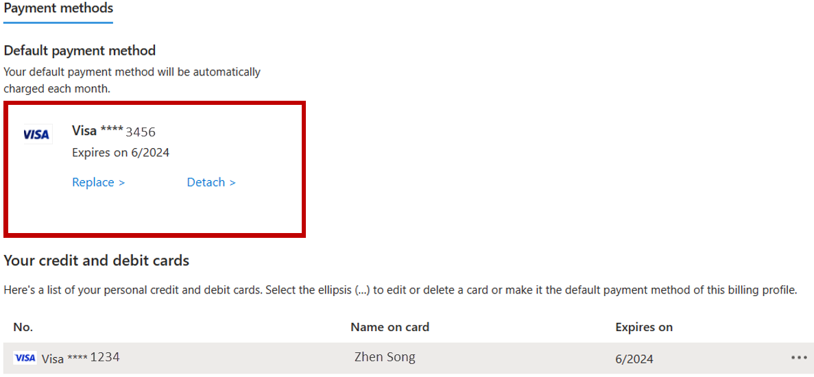Cuplikan layar metode pembayaran portal Azure, dengan info kartu kredit ditampilkan.