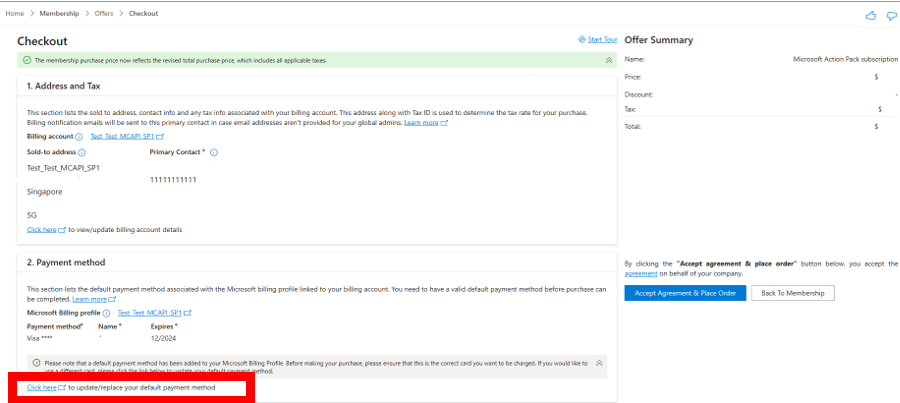 Di halaman pembayaran, di bagian Metode Pembayaran, pilih Klik di sini untuk memperbarui/mengganti metode pembayaran default Anda.