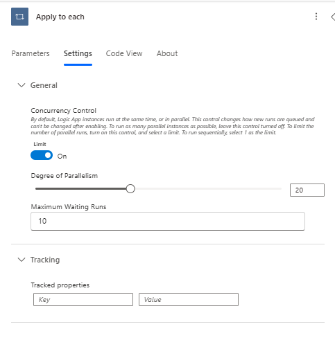 Konkurensi memungkinkan eksekusi paralel dalam Apply to each loop. Secara default, Terapkan ke setiap loop dijalankan secara berurutan, yang dapat memakan waktu lama saat memproses data besar. Jika item dalam loop tidak perlu dijalankan secara berurutan, konkurensi memungkinkan item X untuk diproses sekaligus. Pengguna dapat mengatur tingkat paralelisme antara 1 dan 50.