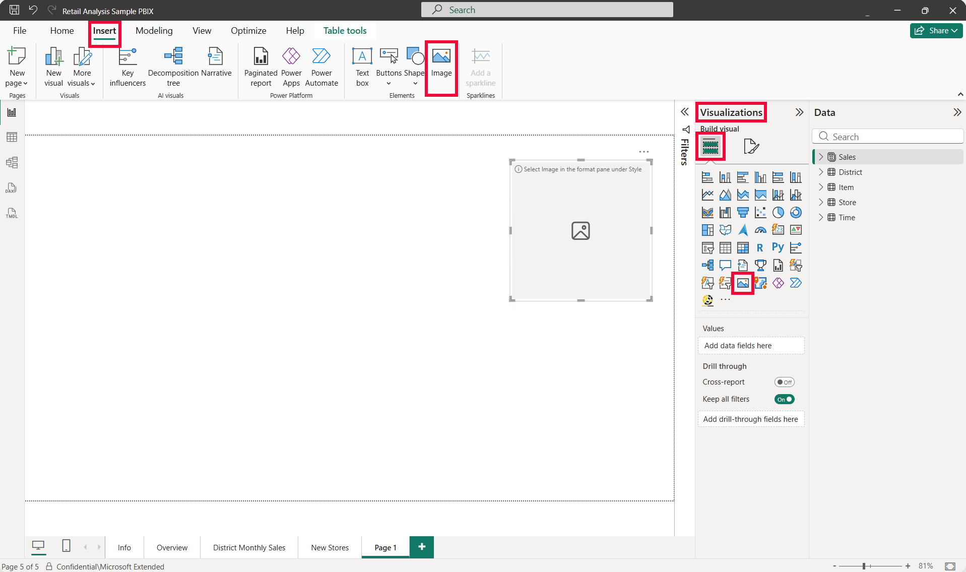 - Temukan dan pilih salinan Retail Analysis Sample PBIX Anda. File terbuka dalam tampilan laporan.