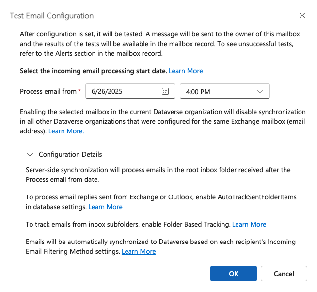 Hasil dari pengujian konfigurasi email ditampilkan di Status Email Masuk, Status Email Keluar, dan kolom Janji temu, Kontak, dan Status Tugas pada rekaman kotak pesan. Pemberitahuan juga dibuat ketika konfigurasi berhasil diselesaikan untuk kotak pesan. Pemberitahuan ini ditampilkan ke pemilik kotak pesan.