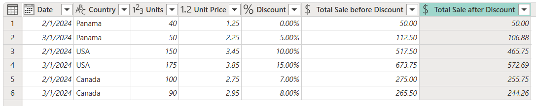 Rumus yang bisa Anda gunakan untuk membuat Total Penjualan sebelum kolom Diskon adalah [Units] * [Unit Price]. Di Jenis data, pilih jenis data Mata Uang .