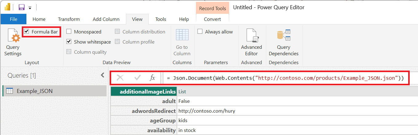 Editor Power Query sekarang terbuka dengan data yang diimpor dari file JSON. Jika belum aktif, pilih tab View di editor Power Query, lalu pilih Formula Bar untuk mengaktifkan bilah rumus di editor.