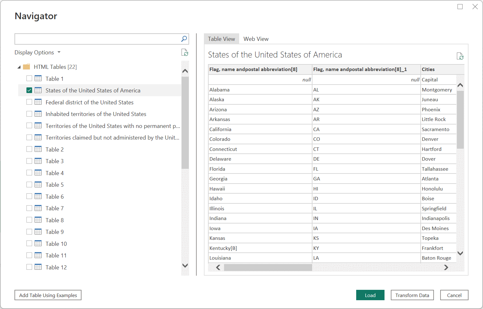 Di sisi kiri bawah dialog Navigator , Anda juga dapat memilih tombol Tambahkan tabel menggunakan contoh . Pilihan ini menyajikan jendela interaktif tempat Anda dapat mempratinjau konten halaman web dan memasukkan nilai sampel data yang ingin Anda ekstrak. Untuk informasi selengkapnya tentang menggunakan fitur ini, buka Mendapatkan data halaman web dengan memberikan contoh.