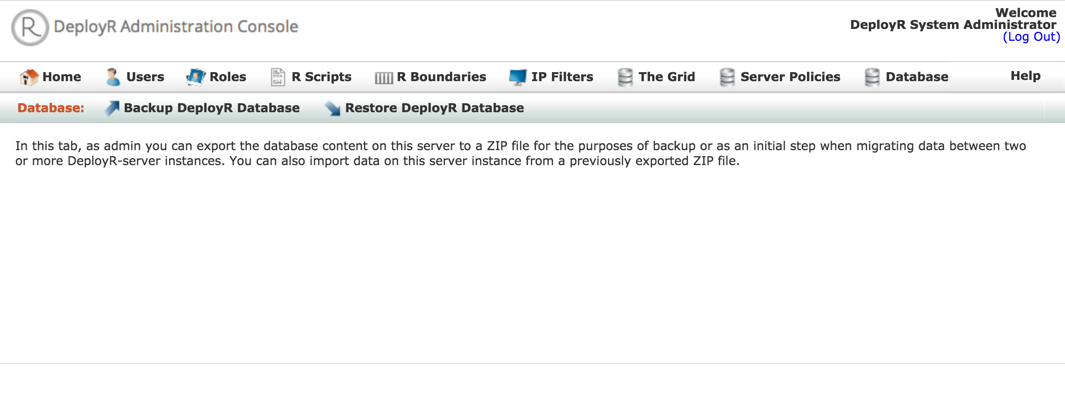 In this tab, you can export the contents of the database used by DeployR into a ZIP file as a way to backup data or as the first step in migrating data between two or more DeployR-server instances. You can also import this content into the repository on this server instance from a previously exported ZIP file.