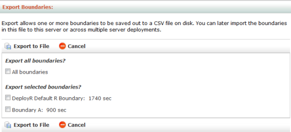 You can export all or selected R boundaries into one CSV file. Exporting can be used to copy the boundaries to another machine or to preserve them as a backup. You can later import the contents of this file to this server or across multiple server deployments.