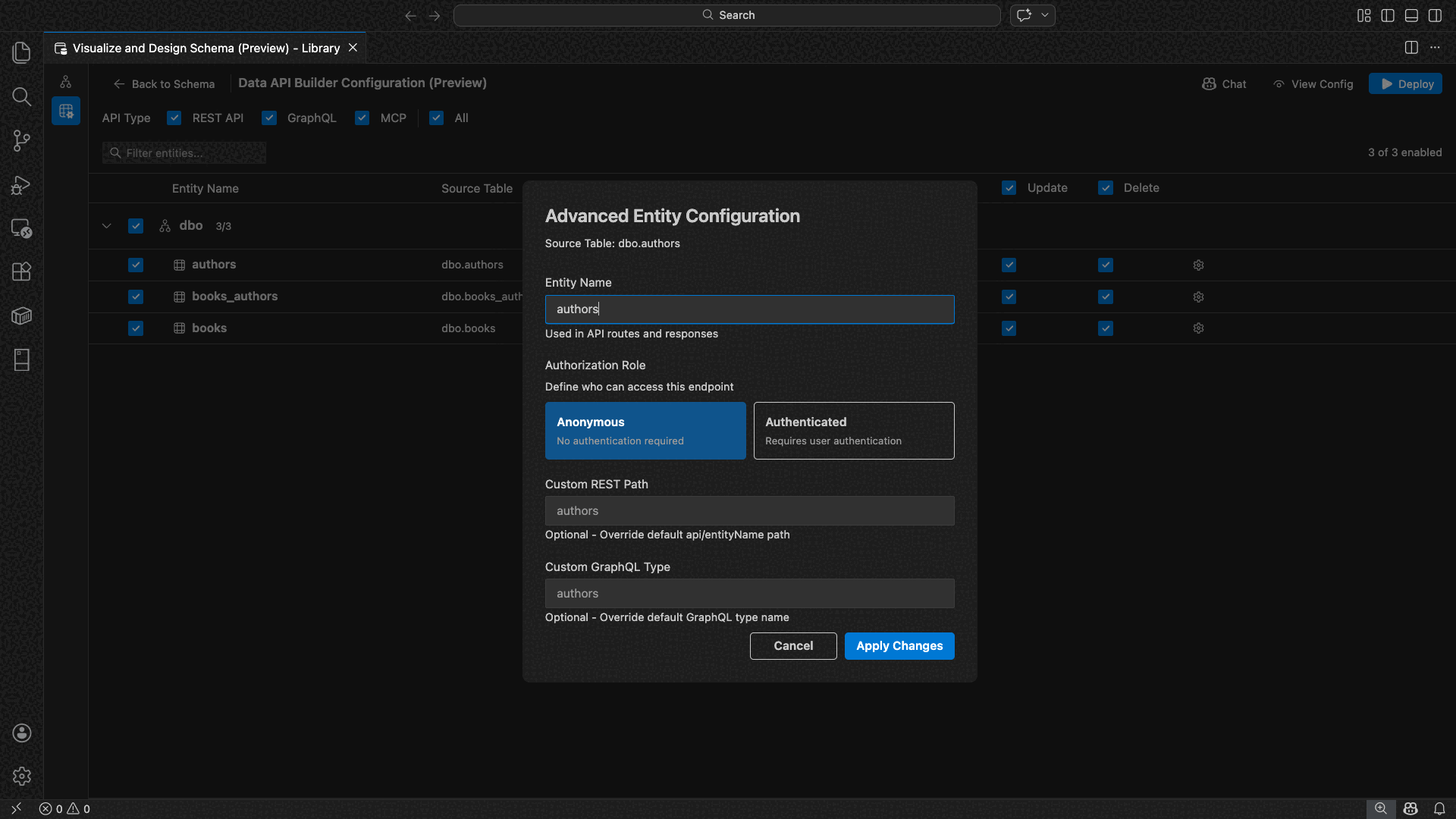 - Konfigurasikan pengaturan entitas tingkat lanjut termasuk jalur REST kustom, nama jenis GraphQL kustom, dan peran otorisasi.