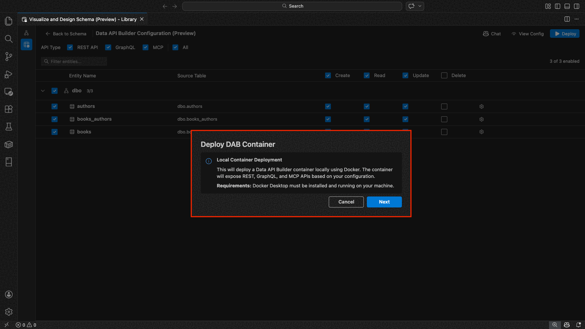 Ekstensi MSSQL untuk Visual Studio Code menyertakan UI terintegrasi untuk penyusun Api Data, sehingga Anda dapat membuat titik akhir REST, GraphQL, dan MCP untuk tabel database SQL Anda tanpa menulis file konfigurasi atau meninggalkan Visual Studio Code. Anda dapat memilih tabel mana yang akan diekspos, mengonfigurasi izin CRUD, memilih jenis API, mempratinjau konfigurasi yang dihasilkan, dan menyebarkan backend lokal yang didukung oleh pembuat API Data, semuanya dari antarmuka visual.